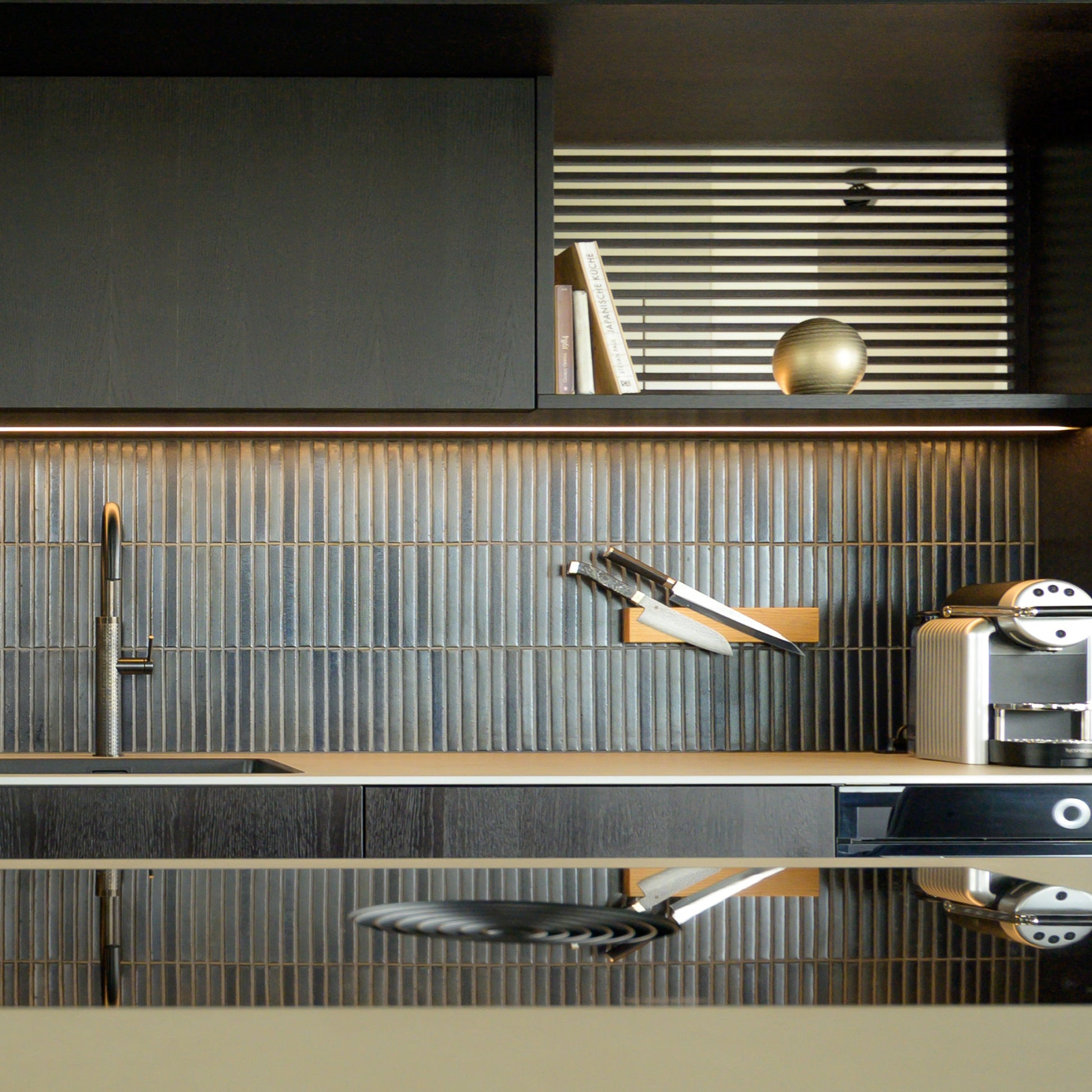 With an elegant 10:1 format (200 × 20 mm), this is a proportion that is exceptionally challenging to produce with consistency, especially in a traditional tunnel kiln. The result is a tile with a refined, elongated presence and glazes with remarkable depth and character.